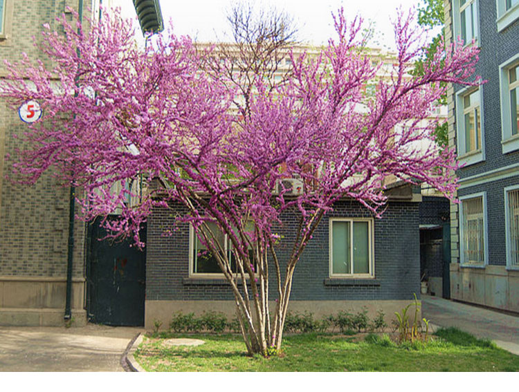 叢生紫荊先花后葉,花形如蝶,滿樹皆紅,艷麗可愛,葉片心形,多叢植于草坪邊緣和建筑物旁,園路角隅或樹林邊緣。因開花時,葉尚未發出,故宜與常綠之松柏配植為前景或植于淺色的物體前面,如白粉墻之前或巖石旁。